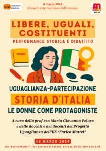 In occasione della Giornata Internazionale della Donna (8 marzo), il gruppo di docenti del “Progetto Uguaglianza” di questo Istituto, con il patrocinio della Rete Ecco!, organizza l’evento dal titolo “Libere, Uguali, Costituenti”. Qui in allegato la circolare.